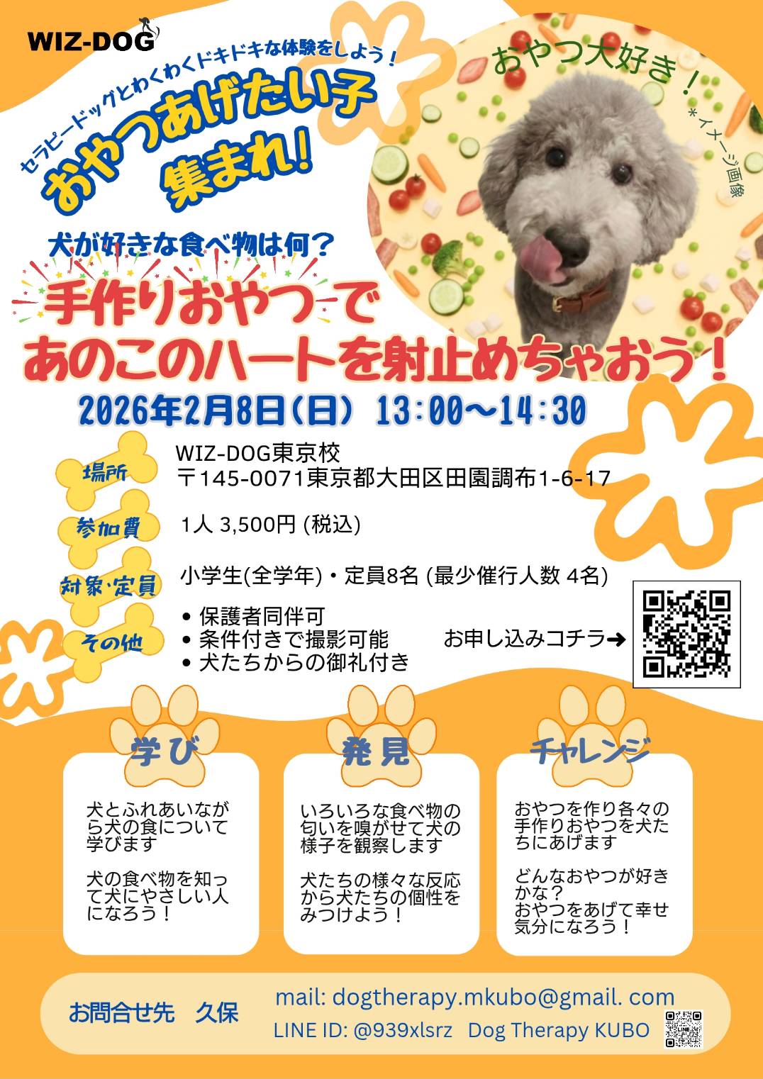 日時2026年2月8日(土)13:00〜14:30 会場WIZ-DOG東京校 〒145-0071 東京都大田区田園調布1-6-17 東急東横線 多摩川駅、および東急池上線 雪ヶ谷大塚駅から徒歩10分 ※専用駐車場が無いためお車でお越しの際はパーキングをご利用ください 参加対象小学1年生〜6年生 参加費用1人/3,500円(税込) 定員8人まで ※最少催行人数 4人 企画セラピストからのコメントわんちゃんにおやつをあげたい人集まれ! この体験会では犬とふれあいながら犬の食について学び、自分で作ったおやつあげに挑戦します。 犬はしいたけやピーマン好き? 犬も美味しいものを食べたら笑顔になる? 自分が作ったおやつ食べてくれるかな? たかがおやつ、されどおやつ……犬の食を通してわくわくドキドキな体験をしよう! 企画者:ドッグセラピスト 久保正枝 |