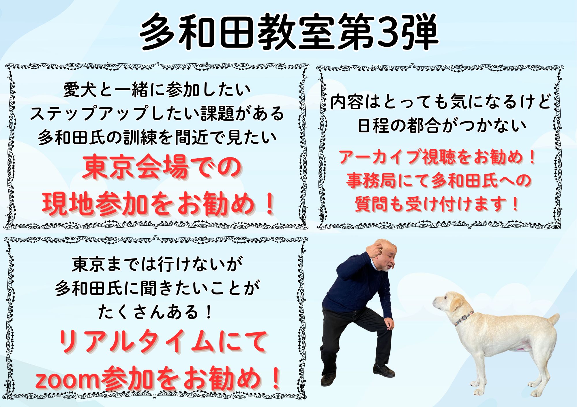 実施日時2025年9月14日(日)・9月27日(土)・10月11日(土)・10月26日(日)・11月9日(日)・11月22日(土)・12月14日(日)・12月27日(土)・2026年1月11日(日)・1月24日(土)すべて13時〜16時(予定)。上記日程につきましては、1回からお申込みができます。 ※ やむを得ない事情がある場合、日時を変更することがございます。 会場WIZ-DOG東京本部(〒145-0071東京都大田区田園調布1-6-17) 講座内容各回の構成は、前半が座学、後半は現地参加またはZOOM参加の方の中から最大4名が多和田悟氏より直接アドバイスを受け、その後、参加者全員でその内容についてディスカッションを行います。 お申込種類@ 現地もしくはZOOMにて多和田悟氏の座学を受講+直接アドバイスを受ける+ディスカッション参加